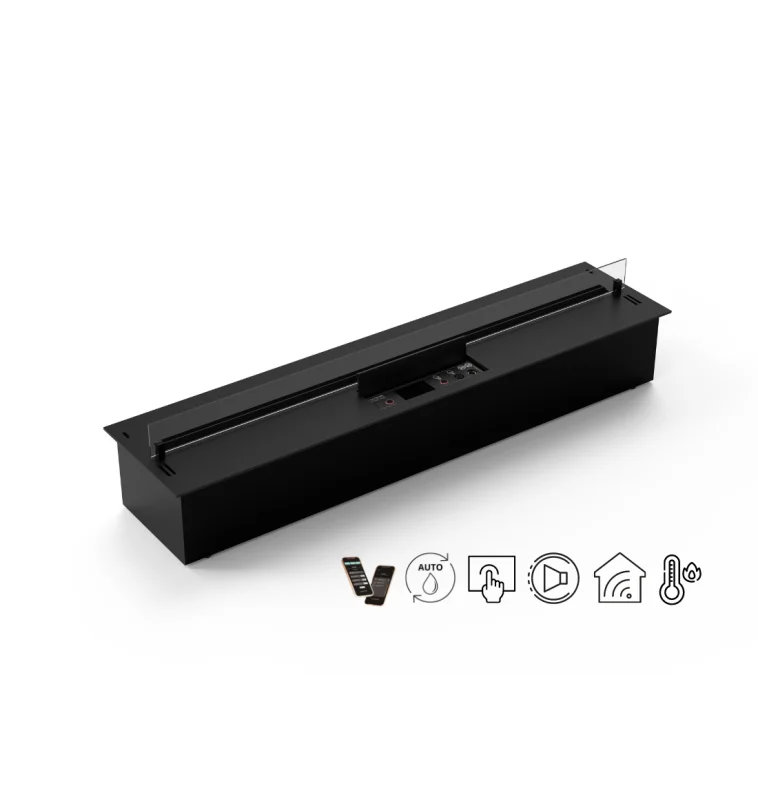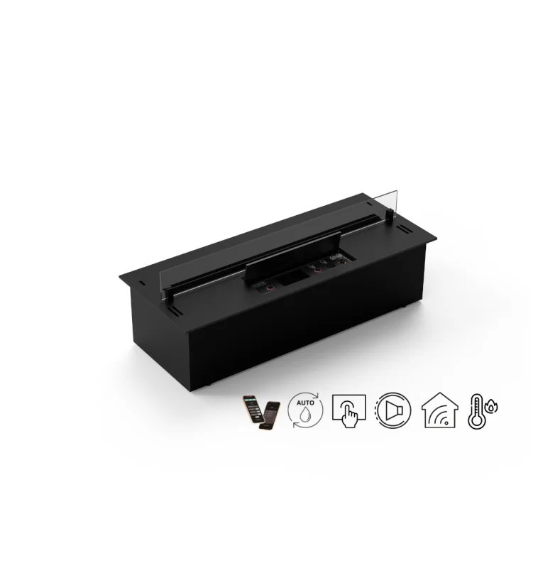 Αυτόματος καυστήρας βιοαιθανόλης με έξυπνο σύστημα ελέγχου, ηλεκτρονικό χειριστήριο, αισθητήρες προοδευτικής ασφάλειας με επιλογή αυτόματης απενεργοποίησης και ηχητικές ειδοποιήσεις.