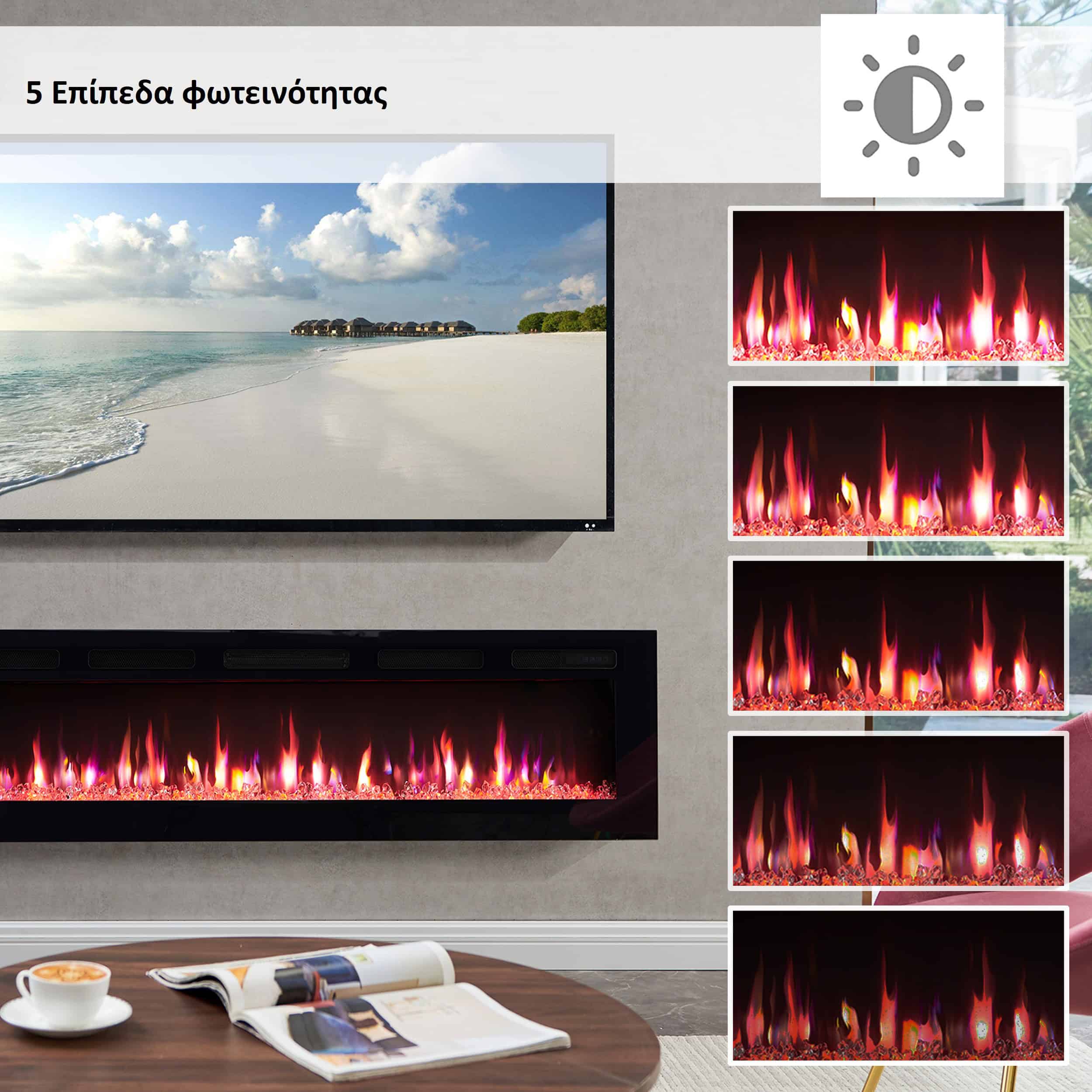 - Ρυθμιζόμενη ένταση σε 5 επίπεδα φωτεινότητας της φλόγας και της εστίας ξεχωριστά.